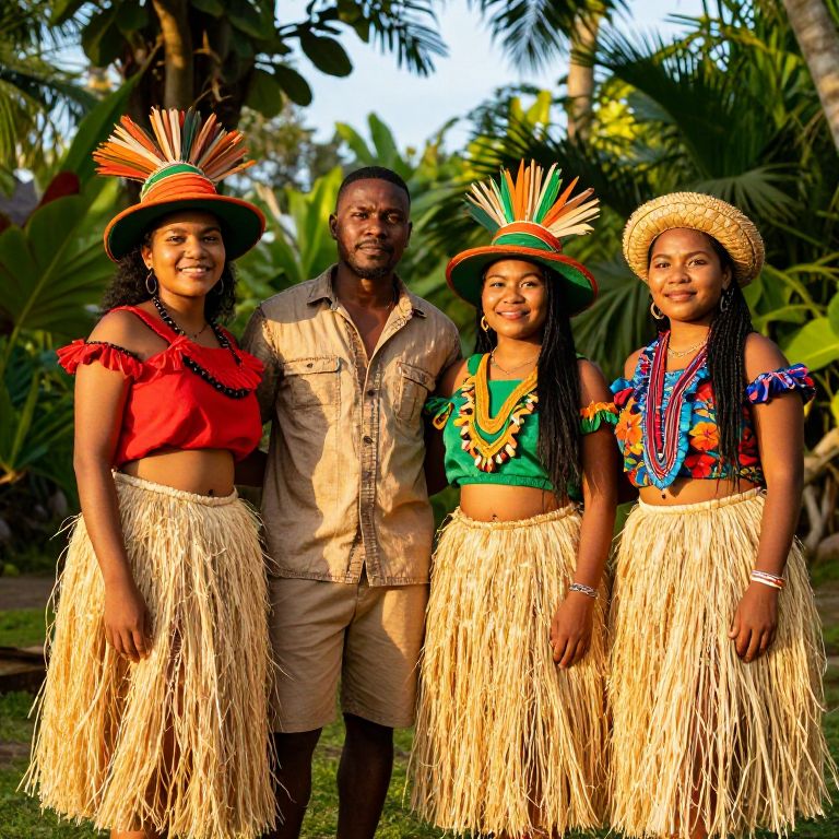 A diverse group of four individuals stands in a vibrant tropical setting, surrounded by lush green foliage and a sunny sky. The first is a female wearing a flowing grass skirt, a bright red top, and a green and orange hat adorned with a decorative crown on her head. The second is a male, dressed in casual, earth-toned clothing, standing beside her with a relaxed expression. The third and fourth are females, both wearing traditional and nature-inspired outfits—each with a grass skirt and a colorful, handcrafted top, one wearing a similar green and orange hat with a crown, the other with a floral pattern and a woven headpiece. The scene exudes warmth, cultural richness, and a sense of joy, with sunlight filtering through the trees and adding golden highlights to their garments and features.