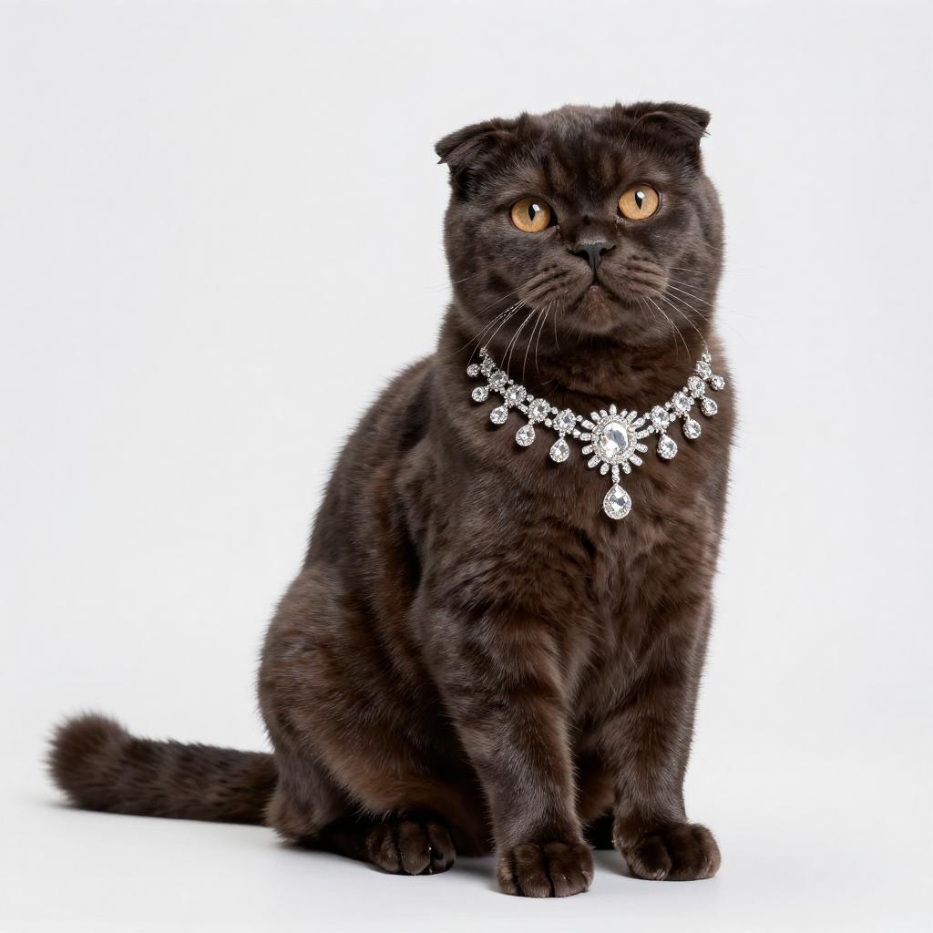 Luxurious studio portrait of a Scottish Fold cat sitting upright, glossy dark fur, wearing an ornate sparkling diamond necklace, clean white background, high-end fashion pet photography, high resolution, ultra-detailed