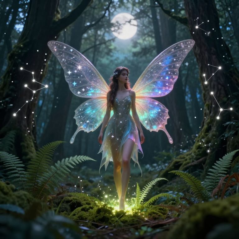 Photograph-style digital artwork of a fairytale-like scene in a dark, enchanted forest. A translucent, glowing fairy with delicate, semi-transparent wings and a flowing white dress hovers mid-air. Her hair is dark and wavy, and she wears a small, sparkling crown. The forest floor is illuminated by numerous glowing, red-capped mushrooms, with tiny lights scattered among the moss and foliage. The background is a deep blue, with tall, shadowy trees creating a mystical atmosphere. The fairy's ethereal wings and dress contrast sharply with the dark, magical forest setting.