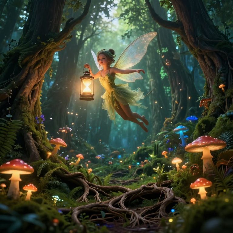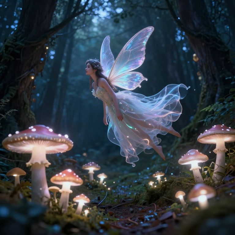 Photograph of a glowing fairy with translucent wings, wearing a flowing white dress, flying among luminous, red-capped mushrooms in a dark, enchanted