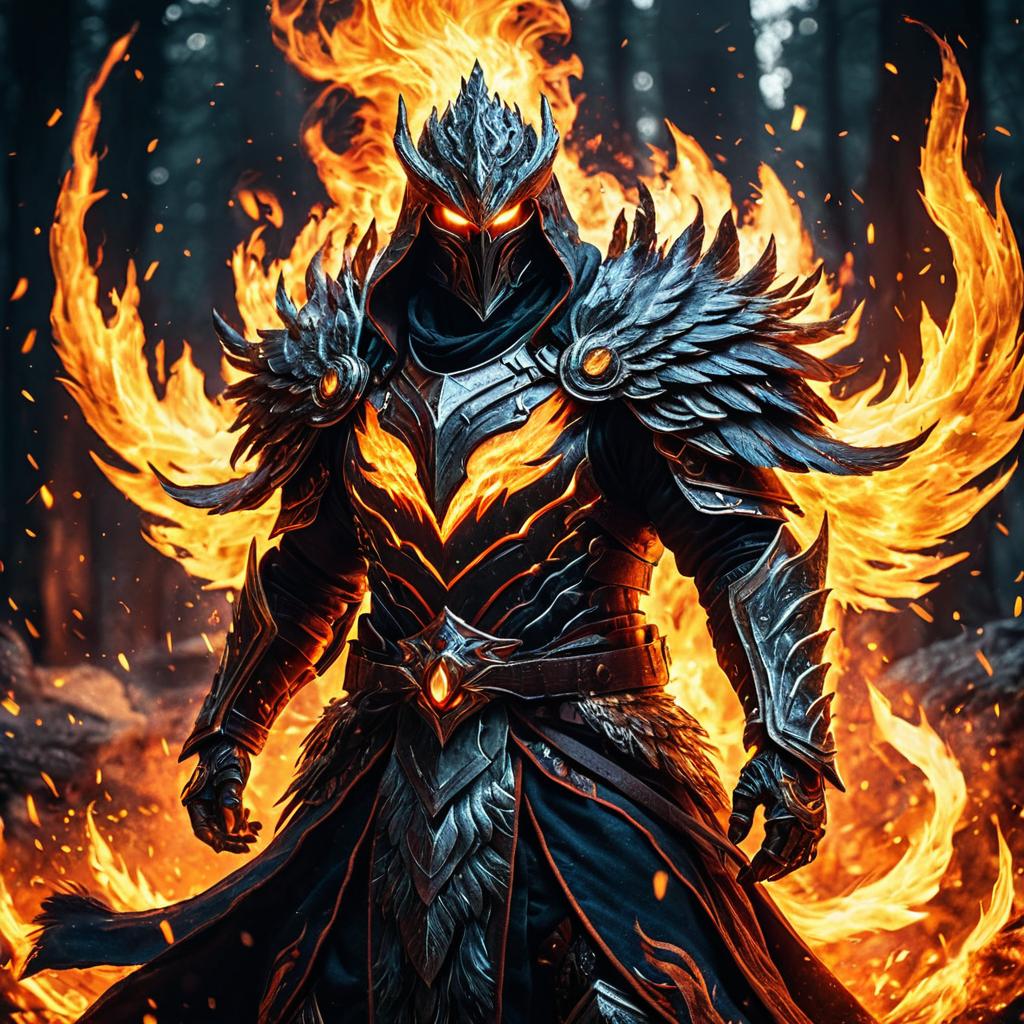 Infrared full-length portrait of a fierce warrior depicted as a reborn fire spirit. The warrior is clad in highly detailed molten feathered armor with glowing fiery elements and a cloak bursting with flames. The image features cinematic lighting and a sharp focus, blending anime aesthetics with hyper-realistic 8K HD rendering. The intense dynamic pose enhances the dramatic and powerful atmosphere in a forest setting.