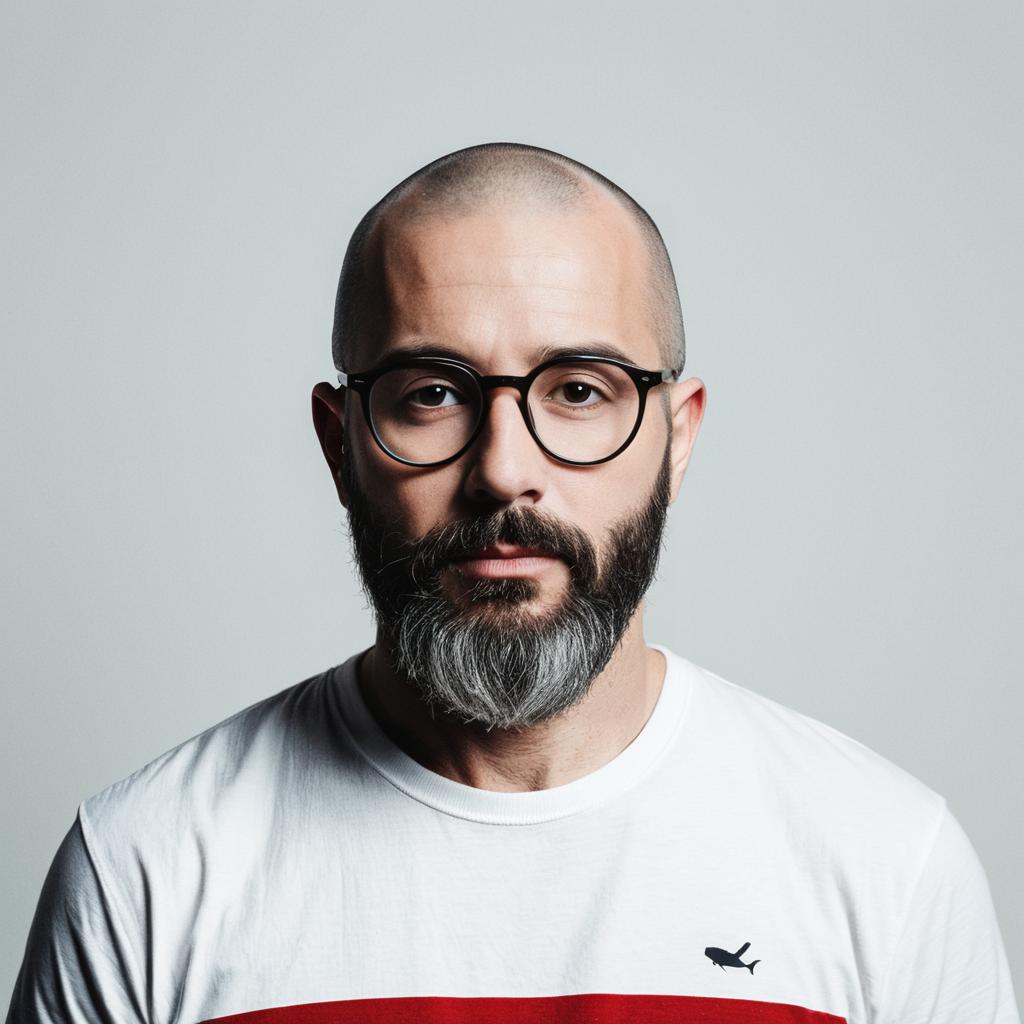 Bearded artist drawn like a logo, with full beard, bald head, White cotton t-shirt with horizontal red stripes very regular and 1cm large, round glasses, high quality, detailed design, minimalistic, professional lighting, cool tones, minimalist style, highres, detailed facial hair, mature, sophisticated, cool tones, minimalistic, focused lighting