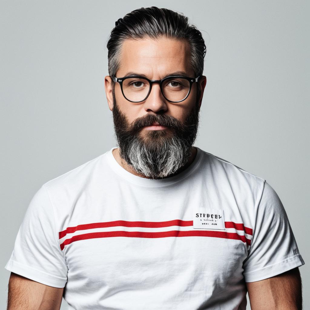 Portrait of a mature bald man with a full, well-groomed beard featuring gray tones. He is wearing round eyeglasses and a white cotton t-shirt with horizontal red stripes. The photo is lit with focused, professional lighting showcasing detailed facial hair and cool tones.
