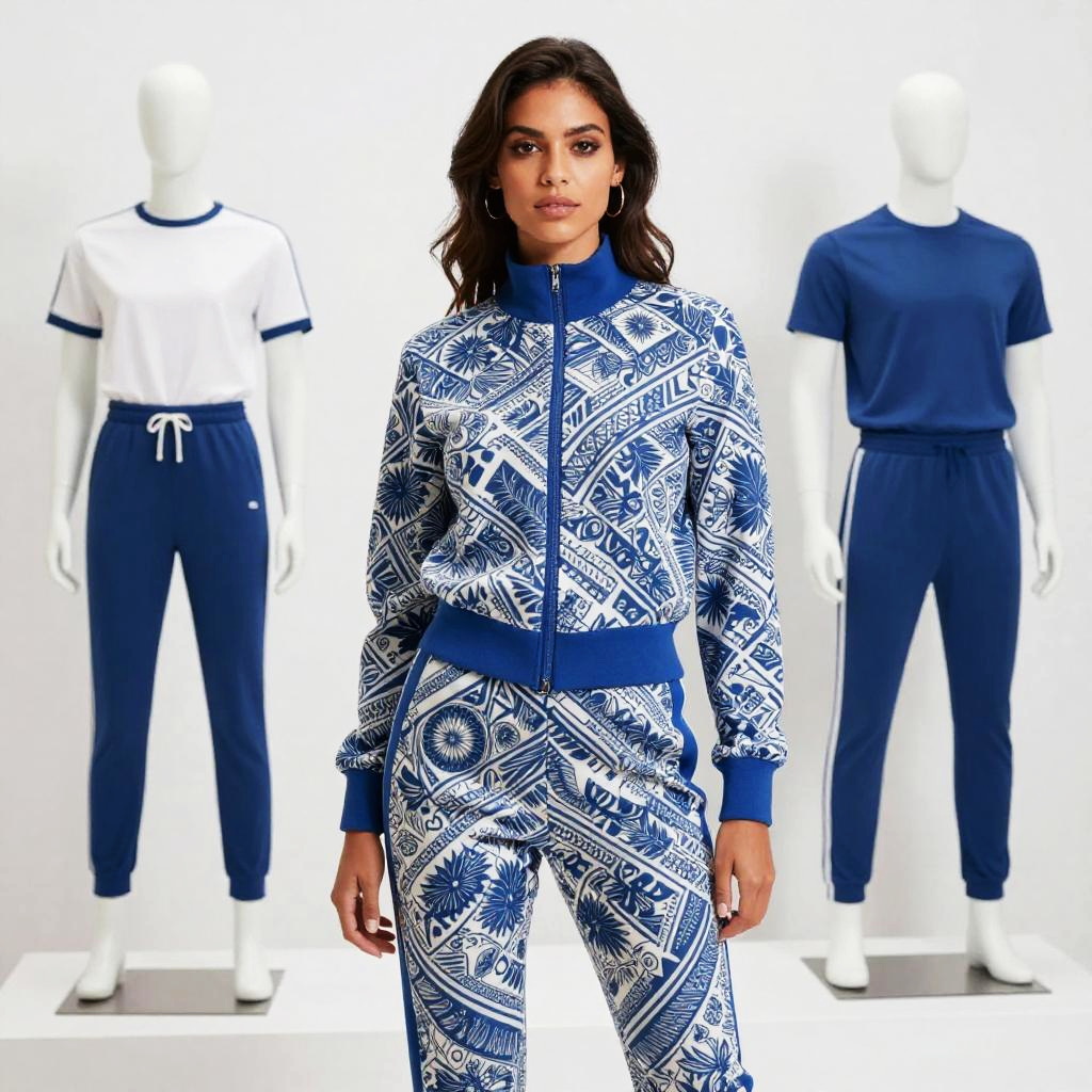 An artistic woman in a blue and white patterned tracksuit stands confidently in front of a mannequin display, featuring designs with a similar style, evoking a sense of fashion continuity and unity.