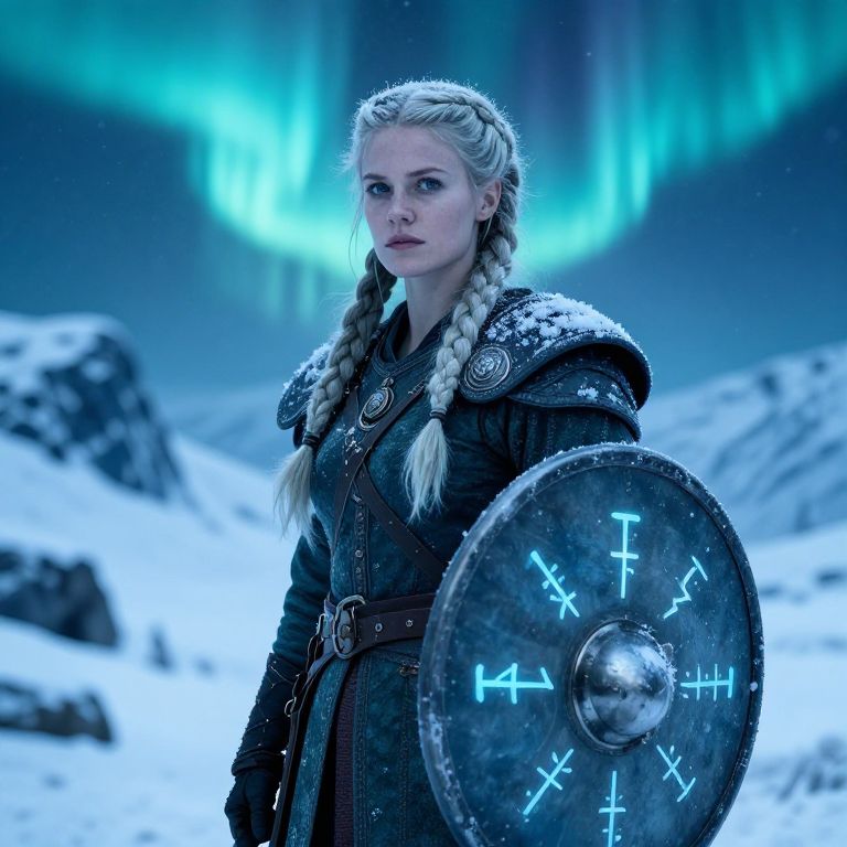 Portrait of a Viking shieldmaiden with Viking filters, showcasing detailed braided hair, glowing runes on her armor, and a frosty blue color palette, standing amid snow-covered mountains and roaring northern lights in the background.