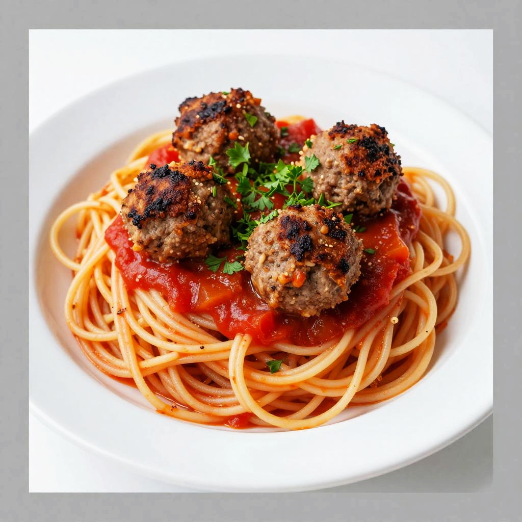 Photograph of a hearty plate of spaghetti topped with four crispy, dark-brown meatballs and a generous mound of bright red tomato sauce. Fresh green parsley sprinkles add a pop of color, and the noodles peek out from underneath. The dish is served on a white plate, set against a plain white background with gray borders.