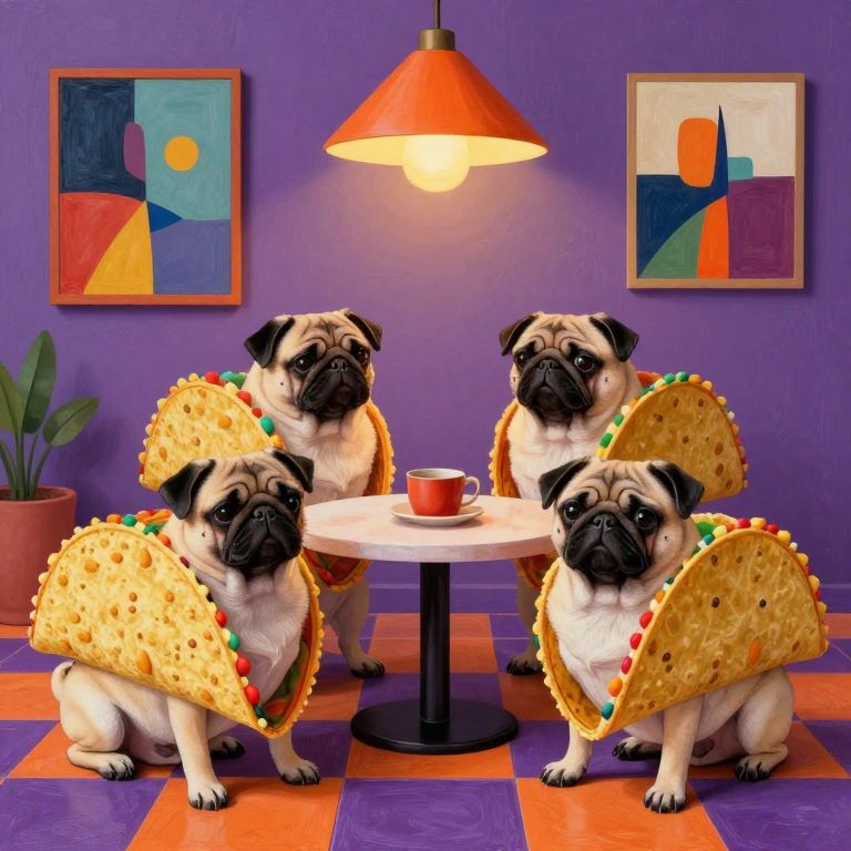 In this whimsical and vibrant scene, four pugs are depicted in an abstract art setting, each wrapped in a large, colorful taco shell. The pugs, with their distinctive wrinkled faces and short muzzles, are arranged around a small table, creating a sense of unity and camaraderie. The background features a rich, purple wall adorned with framed abstract paintings, adding depth and intrigue to the composition. The floor is covered with a checkered pattern of purple and orange tiles, enhancing the playful atmosphere. Above the table hangs a large, cone-shaped lamp, casting a warm glow that complements the overall color scheme. The interplay of shapes, colors, and textures creates a dynamic and engaging visual experience, blending the familiar with the fantastical in a delightful manner.