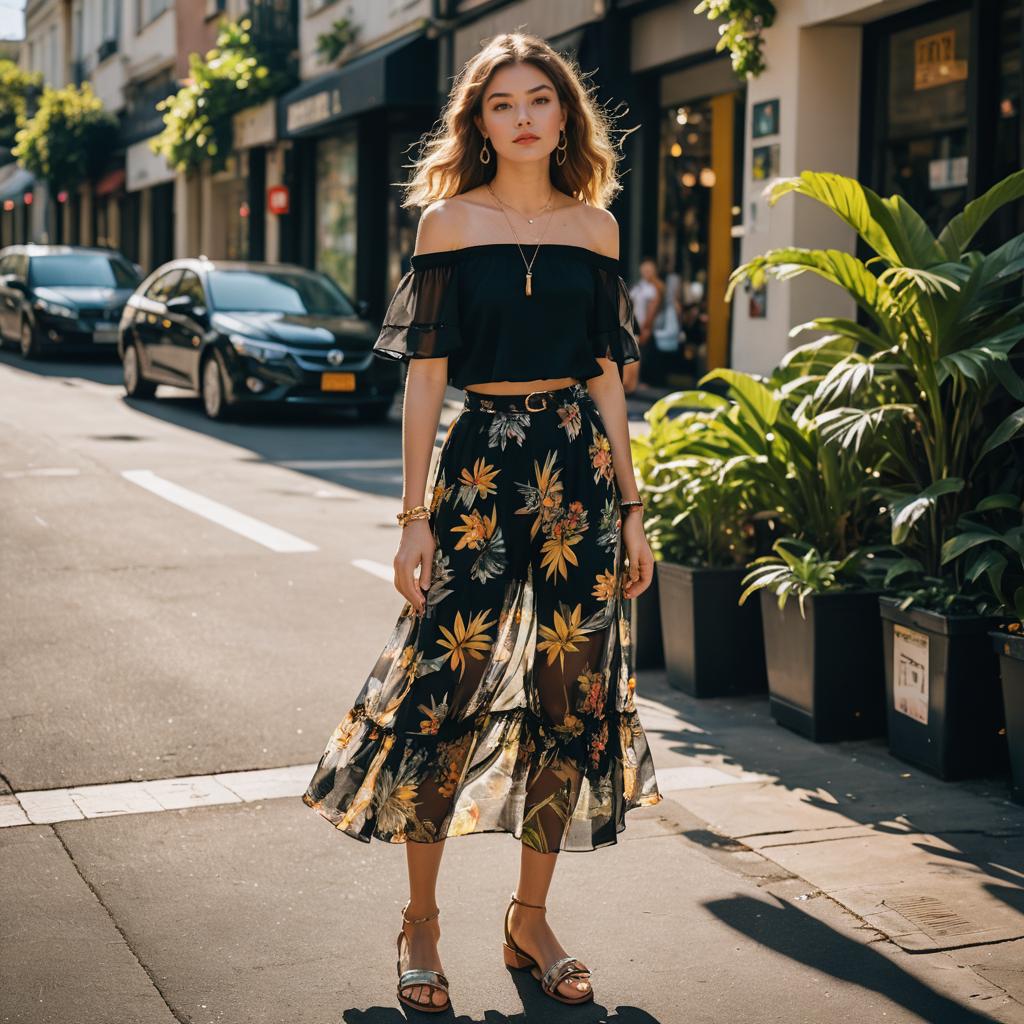Full body shot of a beautiful serene model walking towards the camera on a charming European street. She has shoulder-length wavy brown hair and is wearing a vibrant floral print maxi dress with a slit. She is wearing sporty slides. The street is lined with industrial warehouses with large metal doors. Natural soft diffused lighting, fashion photography, photorealistic, cinematic, sharp focus, 8k.