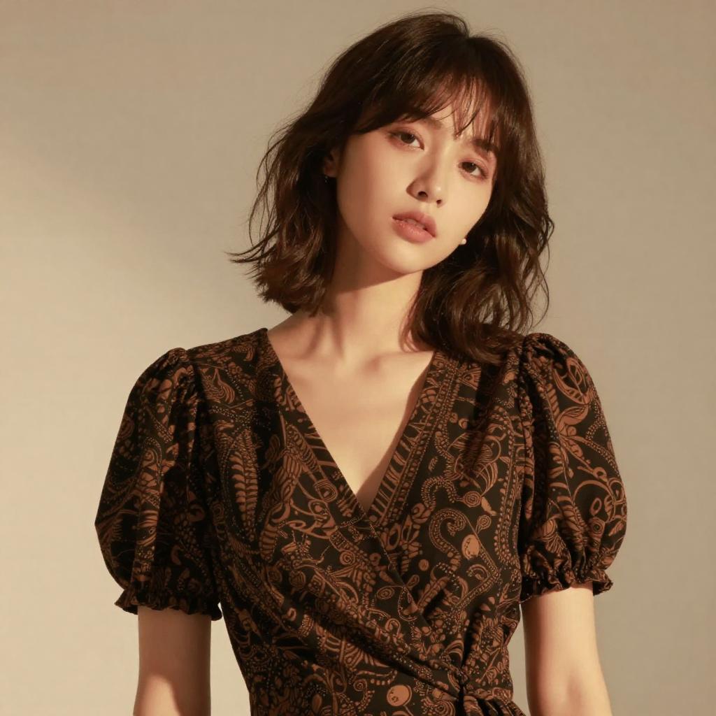 Portrait of a young woman with shoulder-length short layers hairstyle featuring soft waves and bangs, wearing a black and brown patterned dress. The setting is an indoor studio with warm golden hour lighting highlighting her face and outfit. She has light skin and dark eyes, posing confidently in a fashion editorial style.