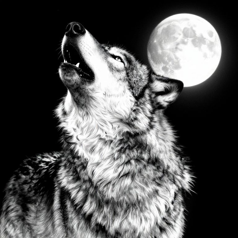 Wolf art black and white, detailed ink illustration of a majestic wolf howling at the moon, intricate fur textures, high contrast shadows, dramatic and mysterious atmosphere