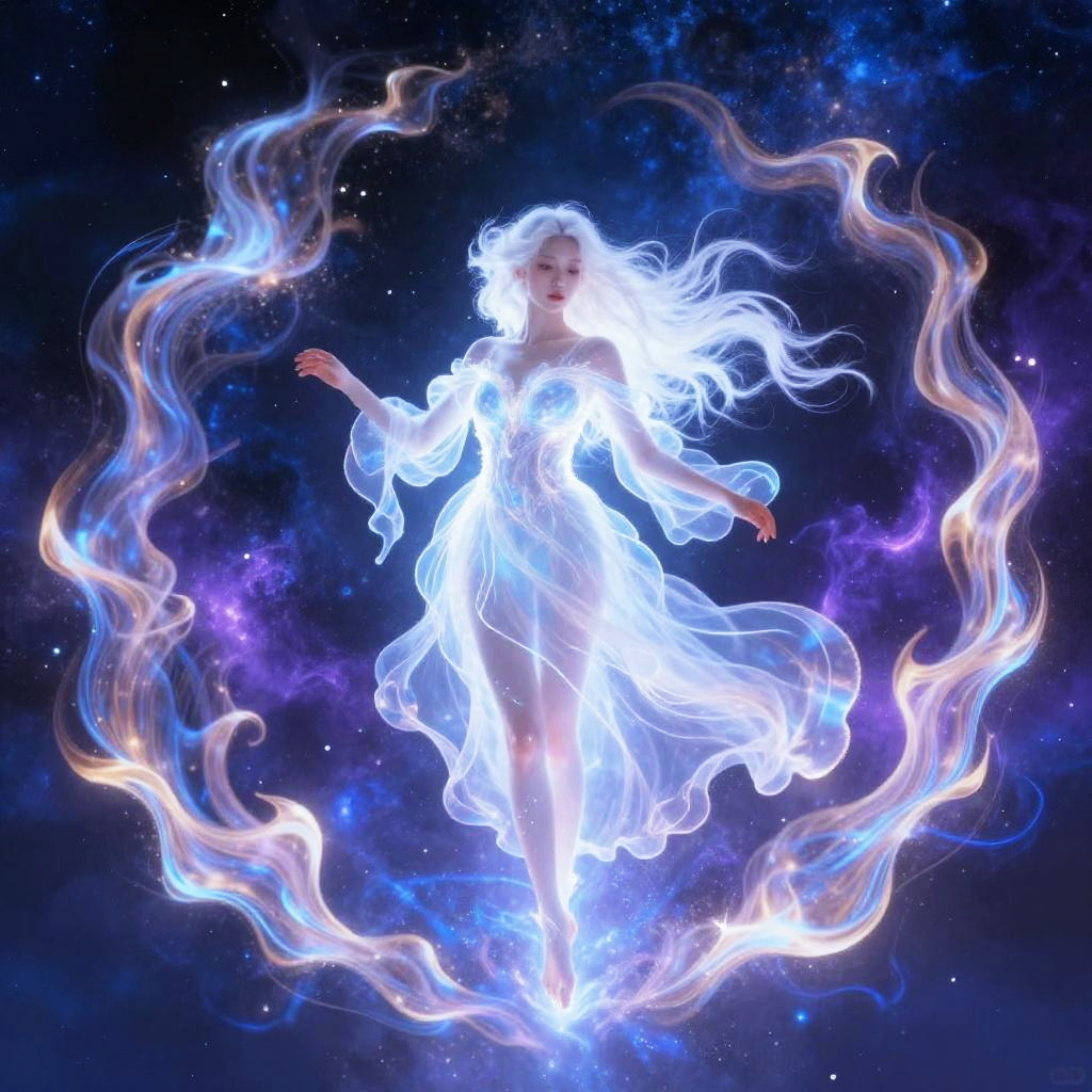 Celestial seer with cascading midnight violet hair, walking gracefully, every step mesmerizing, glowing mercury eyes, ethereal frost skin, a vision of divine beauty and supernatural grace, ethereal and captivating.