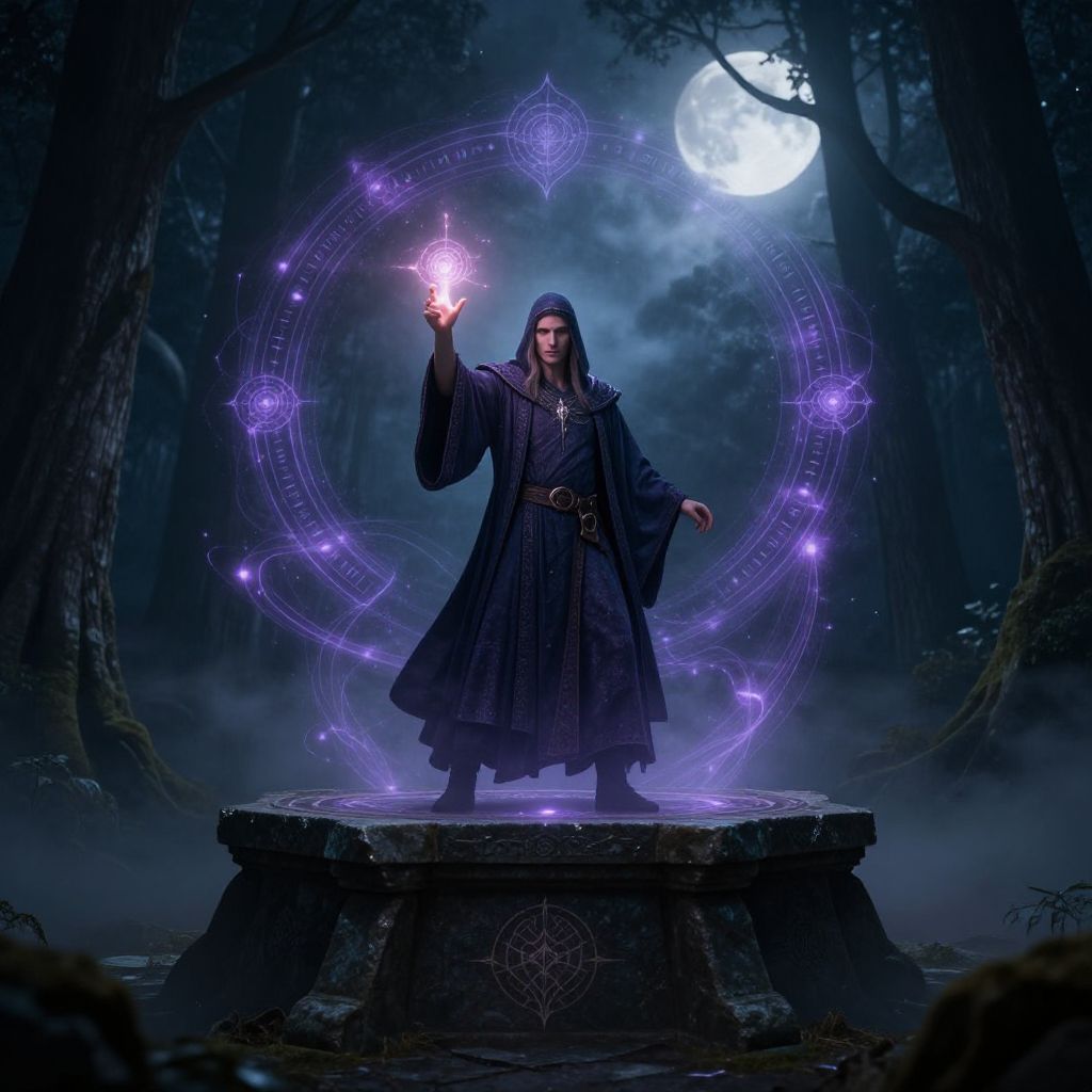 This digital fantasy artwork depicts a mysterious, dark-robed wizard standing on a stone platform in a misty, moonlit forest. The wizard, with long, dark hair and a hood, holds a glowing purple orb in his right hand, surrounded by a mystical, circular, glowing purple symbol. His left hand is extended downward. The stone platform has an intricate, Celtic-like design etched into the front. The background features tall, dark trees and a bright full moon shining through the mist, creating a mystical, ethereal atmosphere. The wizard's attire is dark with flowing sleeves, and his expression is focused and intense.