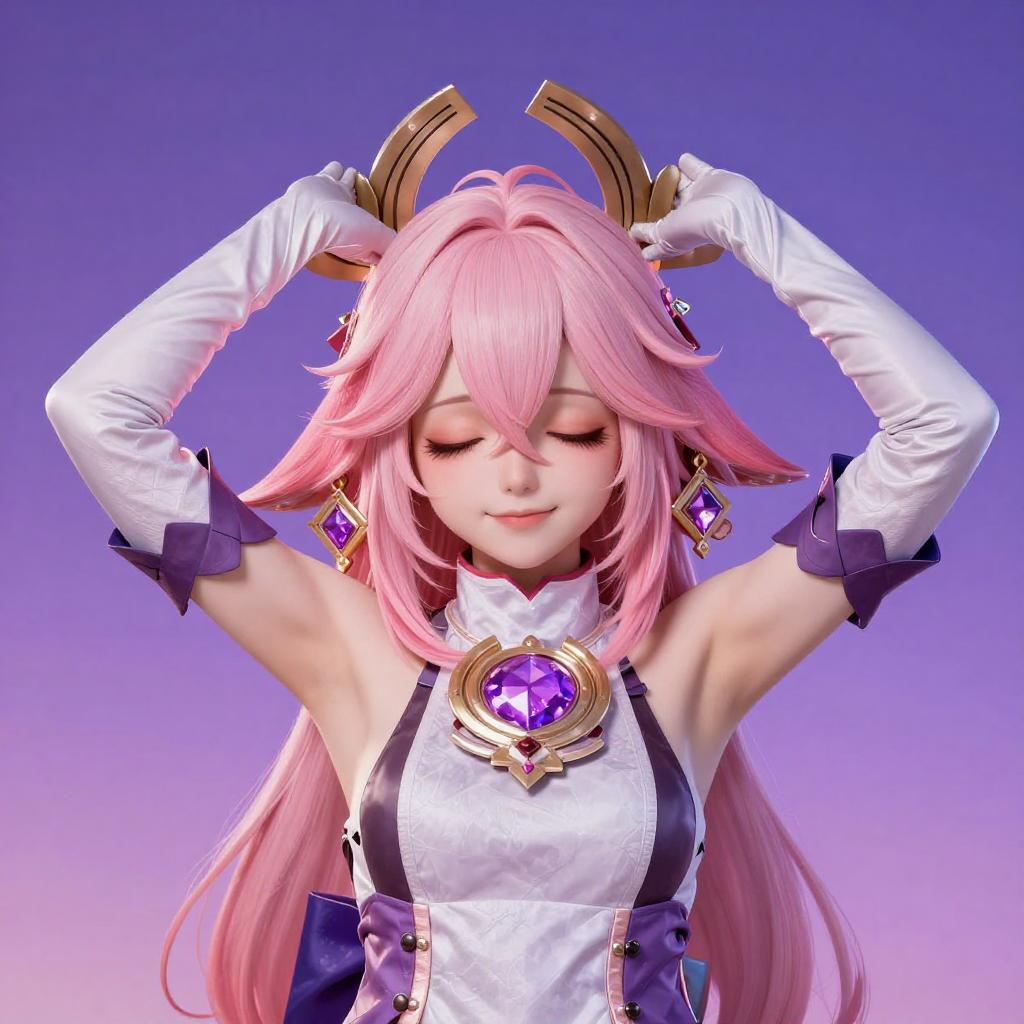 Photograph of a cosplayer with long pink hair, wearing a gold crown with pink horns, white frilled sleeves, and a purple and gold costume with a large blue gem. She is posing with fists raised, eyes slightly closed, and a focused expression. The background is a gradient of pink and white.