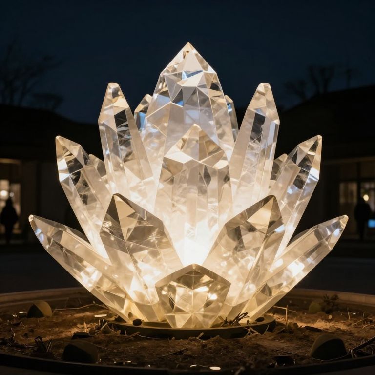 Photograph of a glowing, crystal-like lantern at night. The lantern is made of clear, faceted glass or crystal, resembling a blooming flower. Bright white lights illuminate the interior, creating a radiant, ethereal effect. The lantern is placed in a shallow, dark circular bed of soil with small rocks scattered around. The background is a dark, indistinct night sky, with faint, blurred outlines of buildings and leafless trees visible. The overall scene has a magical, luminous quality.