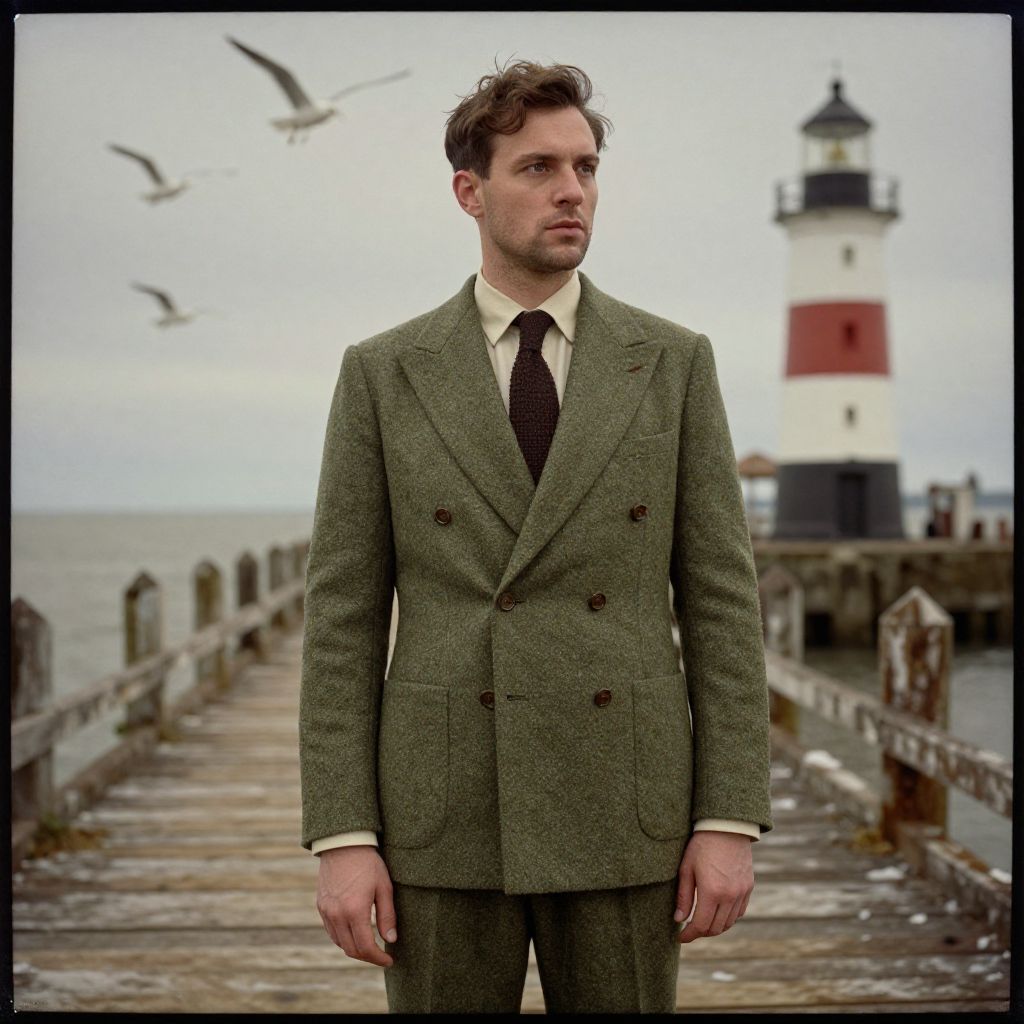 Photograph of a serious-looking Caucasian man with short, wavy brown hair, standing on a weathered wooden pier. He wears a green tweed double-breasted suit with black buttons, a white shirt, and a black tie. The background features a red and white striped lighthouse on the right, and three seagulls flying in the overcast sky. The sea is visible to the left, with the pier extending into the water. The overall mood is somber and moody, with muted colors and a slightly vintage, textured effect.