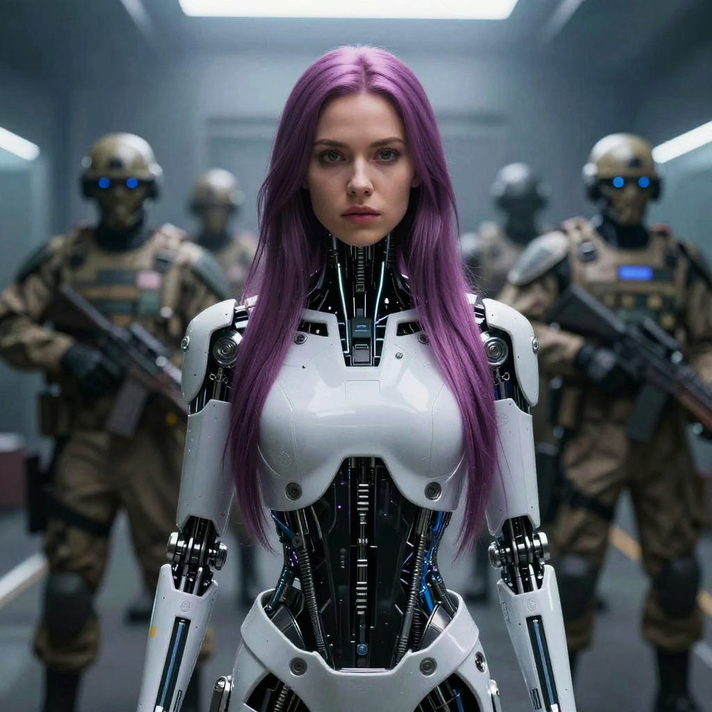 This digital artwork depicts a futuristic scene in a dimly lit, metallic corridor. At the center is a young woman with long, straight, vibrant purple hair. She has a pale complexion and is wearing a sleek, white and black cybernetic armor that accentuates her slender figure. Her expression is serious and focused. Behind her, three heavily armed soldiers in camouflage uniforms and helmets with glowing visors stand in a semi-circle, their rifles at the ready. The soldiers' uniforms and the corridor's grey metal walls contribute to the high-tech, dystopian atmosphere. The lighting is stark, with bright overhead lights casting sharp shadows.