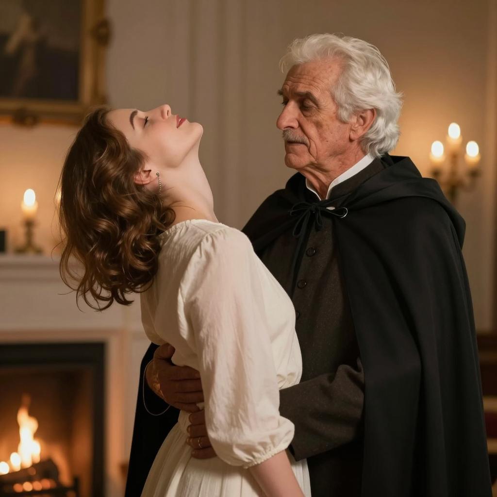 An elderly man with a wrinkled, bald head, wearing a black suit, green bow tie, and brown gloves, is gripping the shoulder of a young woman. The young woman has wavy brown hair, wears a blue dress and a large silver necklace, and looks up with a scared expression. The background features a dark blue gradient, emphasizing the intense and dramatic interaction between the two people.