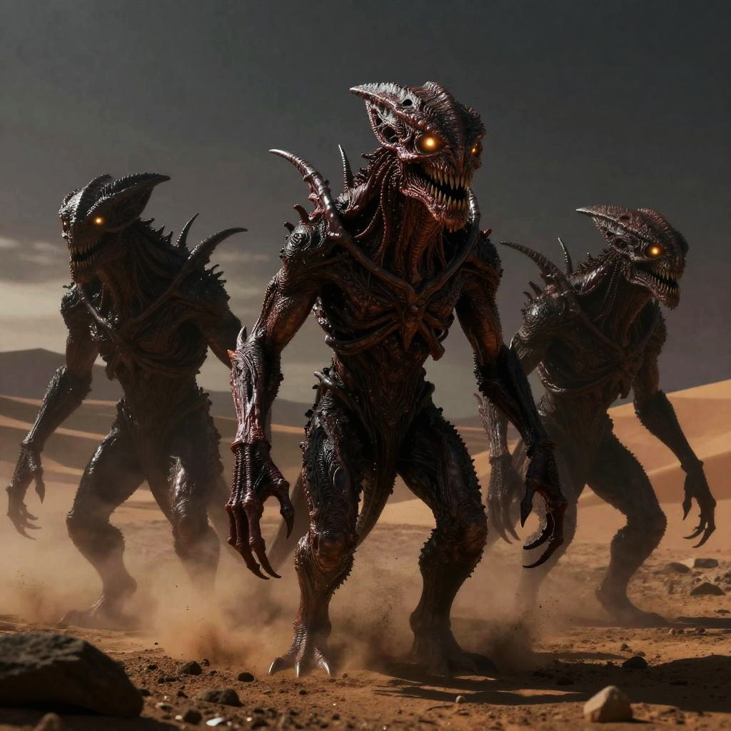 CGI image of three dark, menacing, spiked alien creatures with glowing yellow eyes walking in a desert under a dark, cloudy sky.
