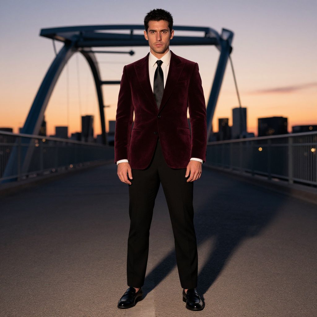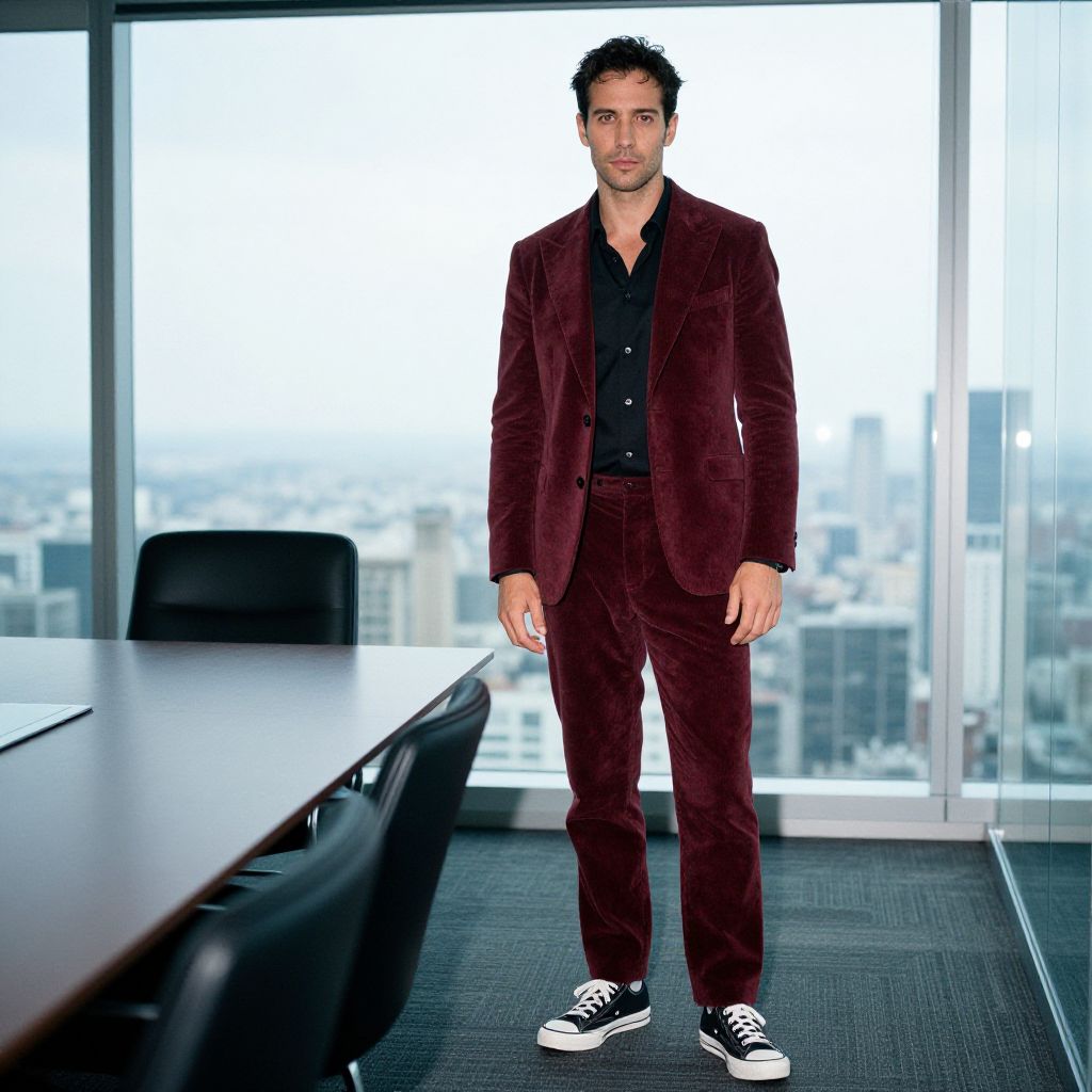 Photograph of a man with short dark hair, wearing a maroon velvet suit, black shirt, and black and white sneakers, standing in a modern