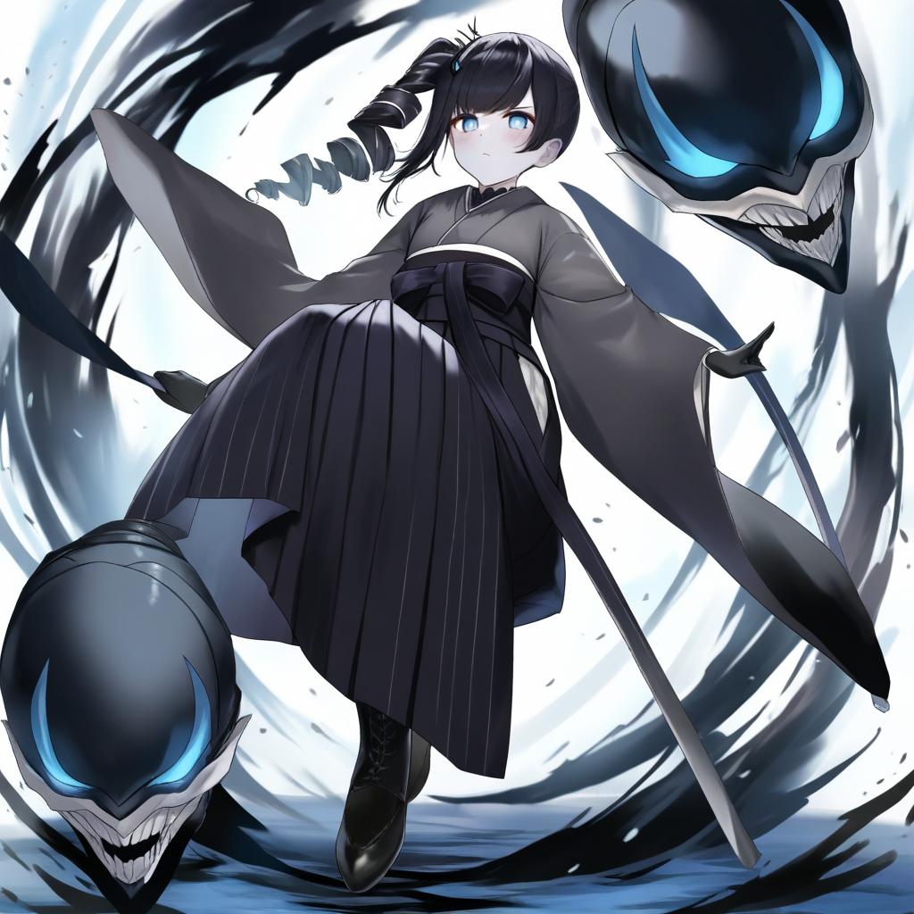 Ancient destroyer oni, kantai collection, 1girl, white skin, pale skin, blue eyes, glowing eyes, mole under eye, black hair, drill hair, long hair, anchor hair ornament, side ponytail, kimono, meiji schoolgirl uniform, kimono, meiji schoolgirl uniform, hakama skirt, black gloves, black footwear, wide sleeves, side drill, by artist kink (tortoiseshell), anime