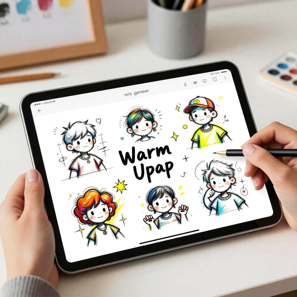 A warm up sketch generator interface displayed on a sleek tablet, surrounded by hand-drawn character outlines and quick gesture drawings, vibrant colors highlighting artistic tools, clean modern design, dynamic and energetic art studio backdrop.