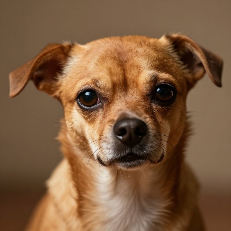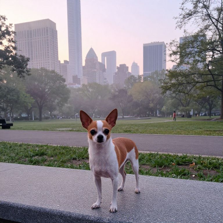 Photograph of a brown and white Chihuahua standing on a concrete ledge in a city park, with skyscrapers and trees in the mist