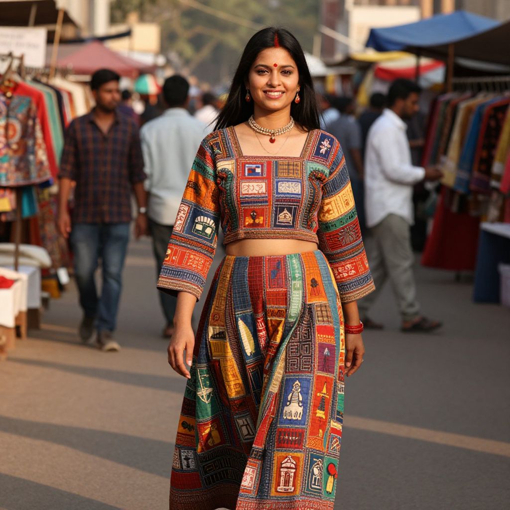 Photograph of a young Indian woman with long black hair and medium brown skin, standing confidently in a bustling marketplace. She wears a colorful, patterned crop top and matching high-waisted skirt, adorned with intricate geometric designs in bright hues of orange, blue, green, and red. She accessorizes with a red bangle and a necklace. The background shows blurred market stalls with various textiles and people, including men in casual clothes. The scene is lively, with natural sunlight casting soft shadows. The woman's expression is serene, and she stands slightly to the right of the center in the image.