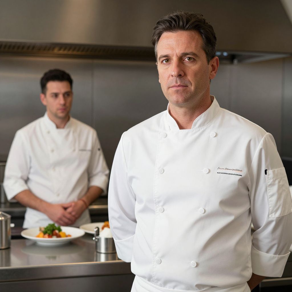 Photograph of two male chefs in white uniforms in a modern, stainless steel kitchen. Foreground chef with dark hair, serious expression; background chef slightly