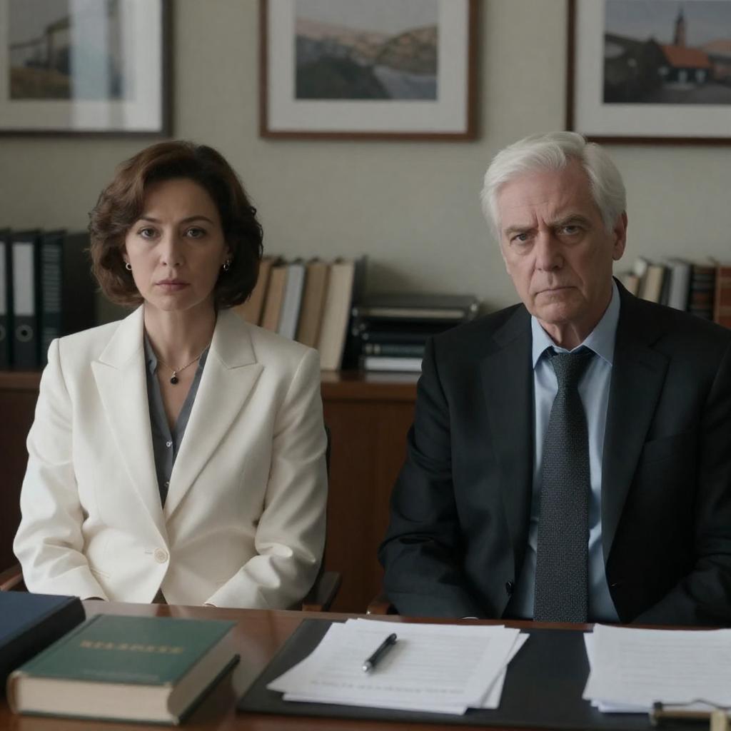 Photograph of a serious office scene: a middle-aged man with gray hair in a dark suit and red tie stands behind a blonde woman with shoulder-length hair in a black blazer and white blouse, pointing at a document she holds. Office background includes glass partitions, wooden desks, and black leather chairs.
