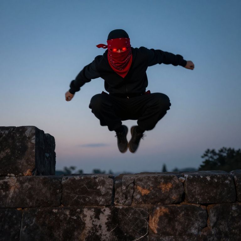 Bandana ninja mid-leap over ancient stone wall, dusk setting, glowing red eyes, dark attire contrasted with bright red bandana, dramatic action scene, hyper-realistic style