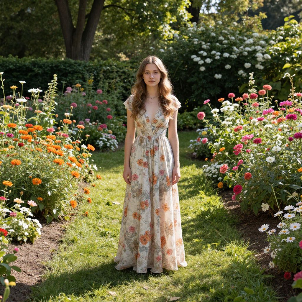 A young woman with light skin and long wavy hair stands confidently in the middle of a vibrant flower garden. She wears a long, flowing gown with a floral pattern, illuminated by bright afternoon sunlight that casts dramatic shadows on the lush green grass. The garden surrounding her is full of colorful flowers including orange, pink, and white blooms, with dense green foliage and tall trees in the background.