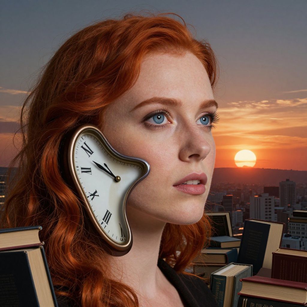 Photorealistic digital art of a fair-skinned, red-haired woman with a clock-shaped face, surrounded by books, at sunset on a city skyline