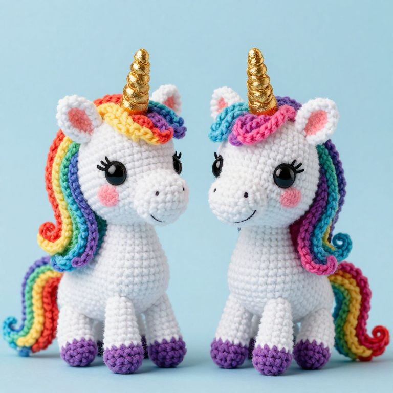 Two charming crochet unicorns sit side by side, each adorned with vibrant rainbow manes and tails, featuring golden horns and rosy cheeks, exuding playful magic against a serene blue backdrop.