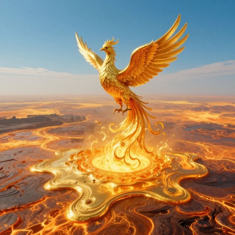 Craft an image embodying surrealism, depicting a captivating aerial view of a fantastical landscape where a majestic phoenix rises from a sprawling sea of molten gold. The scene should showcase the striking contrast between the radiant amber hues of the lava and the serene azure sky above. Employ fluid, organic shapes and whimsical elements reminiscent of melting timepieces to infuse the otherworldly atmosphere with both awe and tranquility, evoking an emotional gradient that encapsulates the essence of rebirth and transformation.