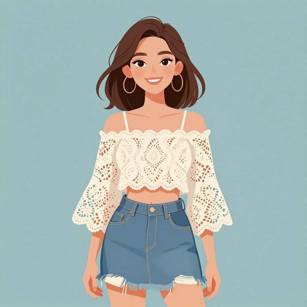 Woman with pretty face and pretty hair. smiling Woman, bohemian, off-the-shoulder cropped lace top in cream, scalloped edges, bell sleeves with lace cutouts, frayed denim mini skirt, high-waisted. --sref 1467