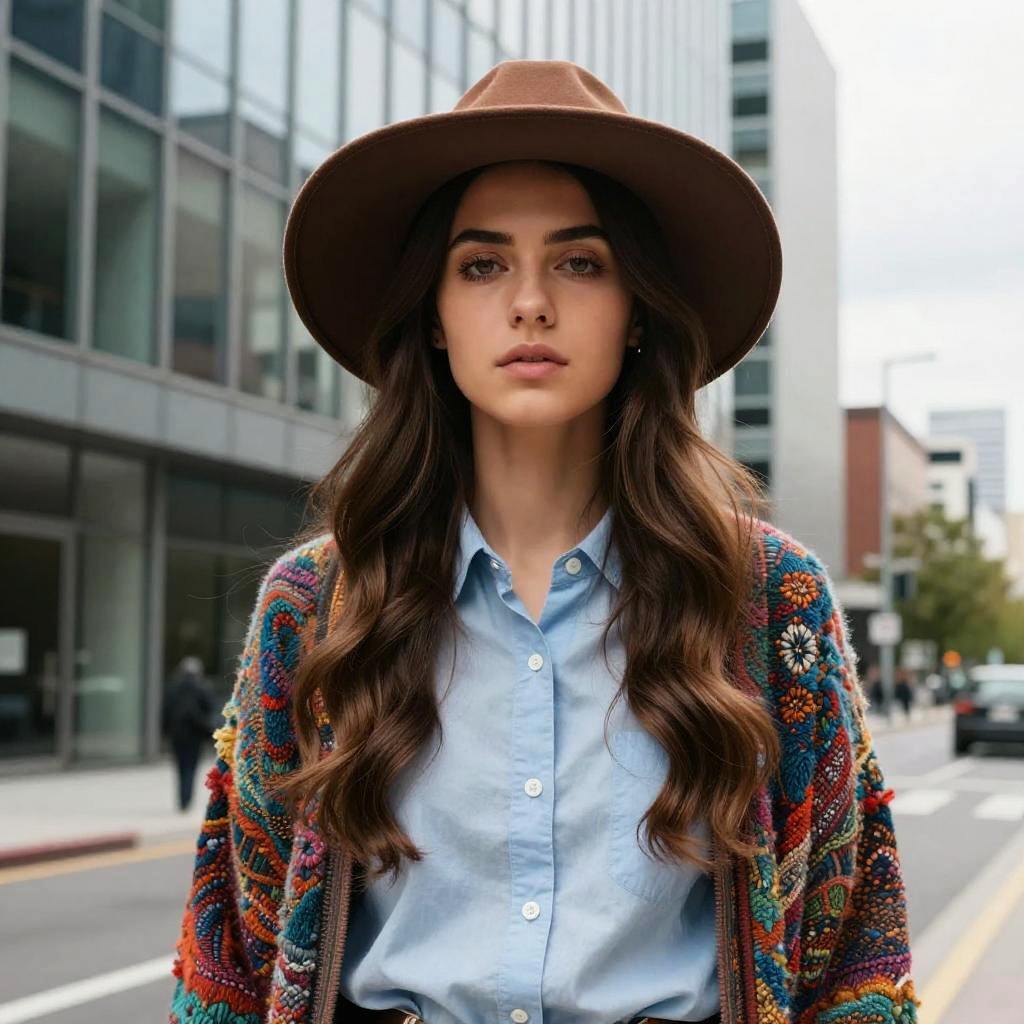 A digitally enhanced photo of a young woman with fair skin and dark brown hair, standing in a sunny, narrow alley between brick buildings. She's wearing a purple velvet jacket, a colorful floral shirt, dark pants, and a shiny brown top hat. She has a serious expression and is looking directly at the camera. The background shows greenery and clear blue skies.