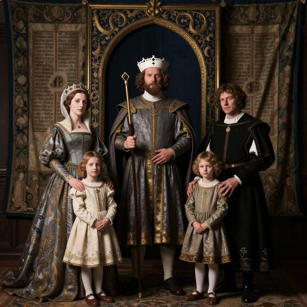 Medieval family portrait, king, queen and children posed gallantly, lush tapestries hanging behind, illuminated manuscript style, deep shadow contrast, elegant and somber mood