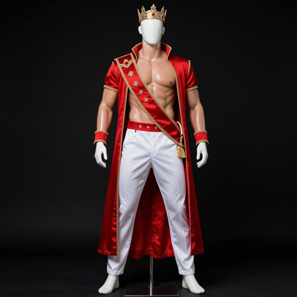 A full-body photograph of a handsome, muscular male mannequin, posed dramatically, wearing a striking red and white outfit adorned with a regal red sash and a golden crown. The lighting is theatrical, highlighting the textures of the costume.