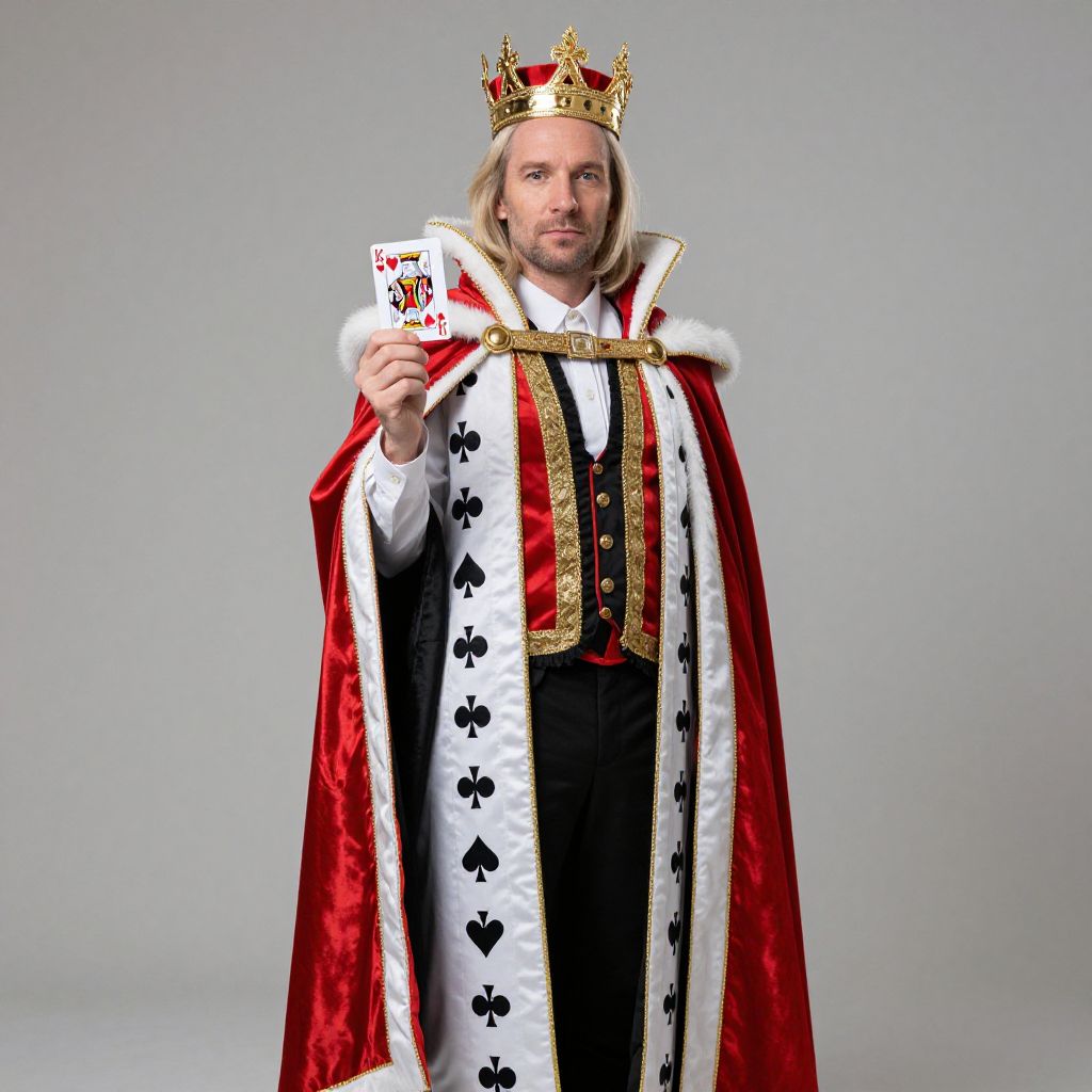 A man dressed in a detailed King of Hearts costume stands confidently against a neutral background. He is wearing a royal robe adorned with red, black, and white colors featuring card suit motifs, topped with a golden crown, and holding a King of Hearts playing card, embodying a regal cosplay style.
