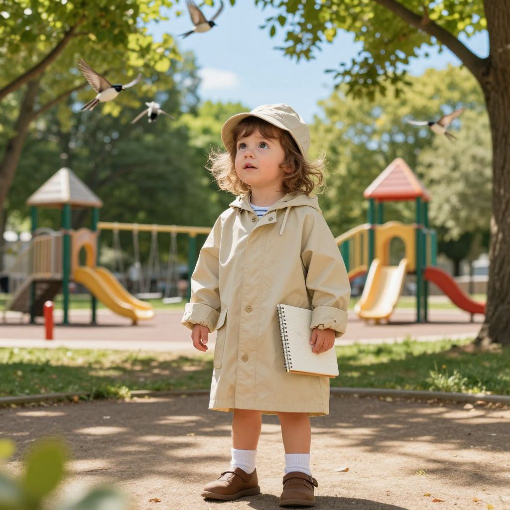 A young child with bright, curious eyes and a playful expression is wearing a beige raincoat with a hood and a matching hat. The child has soft, curly brown hair slightly tousled by the wind, and a small, slightly smudged notebook tucked in one hand, as if they're about to draw something. They are dressed in white socks and brown shoes, standing in a sunny park with lush green trees, a colorful playground in the background featuring swings, a slide, and a small climbing structure. Birds flutter in the sky, and dappled sunlight filters through the leaves, casting gentle patterns on the ground. The scene is warm and cheerful, capturing a moment of simple joy, innocence, and pure curiosity as the child looks up with wonder at the bright blue sky—perfectly conveying a sense of childhood magic and peacefulness.