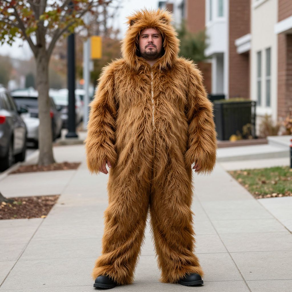 Photograph of a bearded man standing on a suburban sidewalk in a full, fluffy brown bear costume with a hood, looking serious. Background includes parked