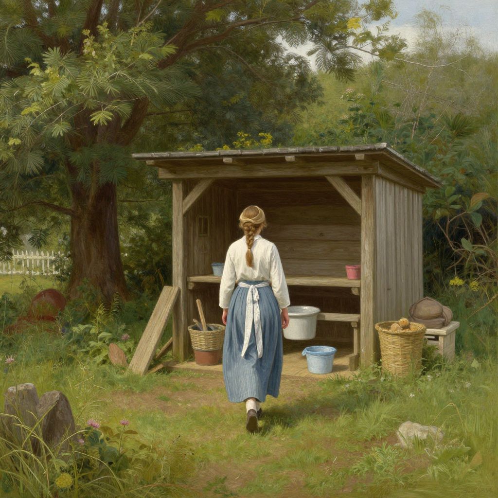 A serene rural scene rendered in a hyper-realistic digital art style, featuring a woman in traditional attire walking toward a quaint washhouse, surrounded by lush greenery and bathed in soft natural light, evoking the pastoral charm reminiscent of Daniel Ridgway Knight's works.