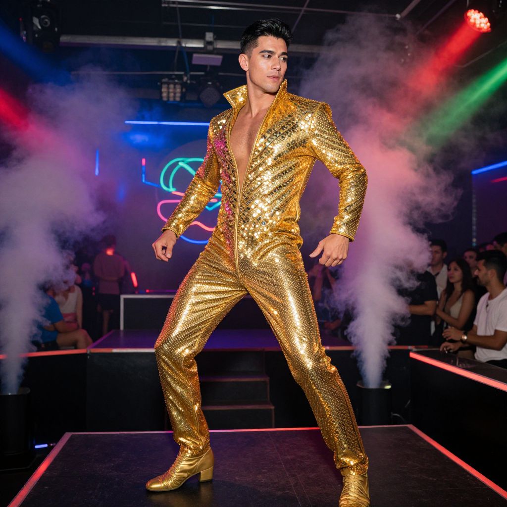 Photograph of a muscular man in a shimmering gold sequined suit and boots, striking a confident pose on a stage with colorful neon lights and smoke