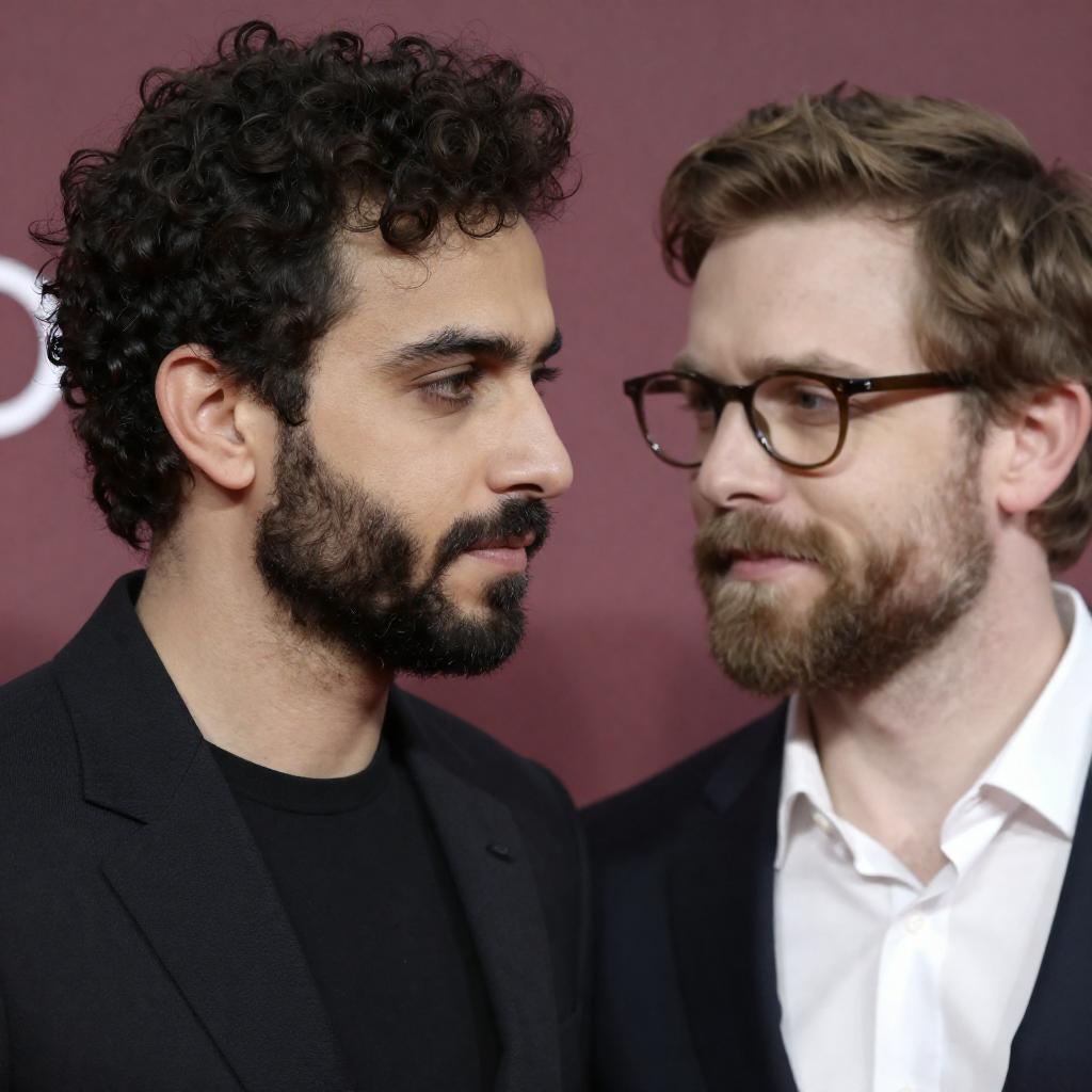 Photograph of two men standing outdoors. Both wear black suits; one with a white shirt and black tie, the other with a black shirt. First man holds a clear glass, second man smiles. Green foliage background. Both have curly hair, first man's brown, second man's black. First man's expression neutral, second man's expression happy. Both stand close together, facing camera.