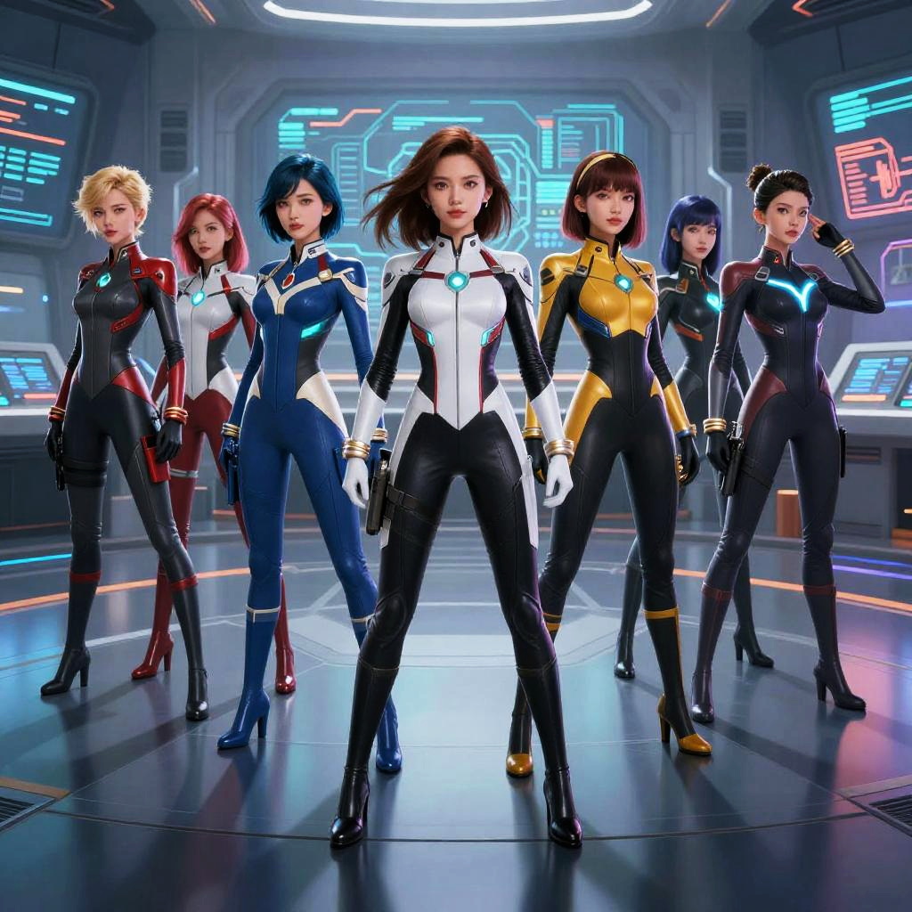 CGI image of six women in tight, futuristic bodysuits standing in a high-tech lab, each with unique color schemes and confident poses.
