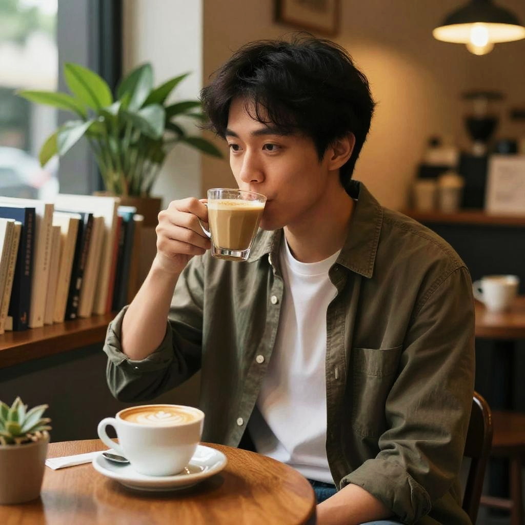 Random asian guy sitting in a cozy coffee shop, sipping a latte, surrounded by books and plants, warm ambient lighting, casual modern outfit, candid moment captured with rich detail and soft shadows
