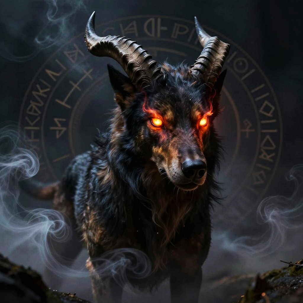 Dark fantasy hellhound art showing an ethereal canine creature with smoldering ember eyes and jagged horns, surrounded by swirling smoke and mystical runes, high contrast lighting emphasizing its terrifying presence.