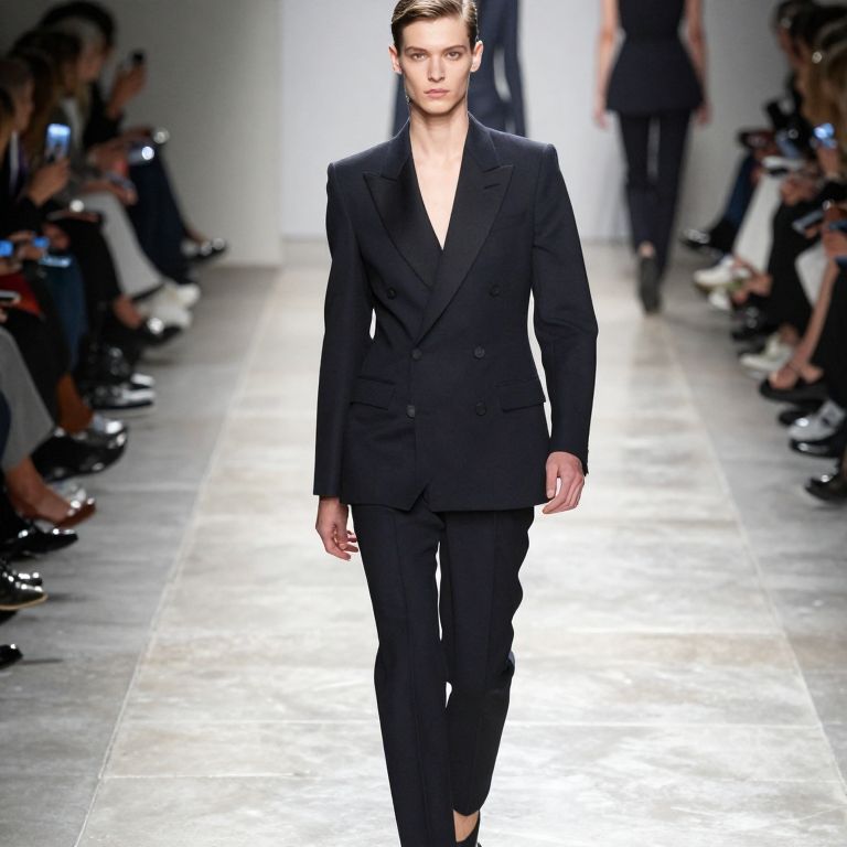 Male model in black double-breasted suit, white shirt, and black pants walks down a bright, minimalist runway with seated audience.