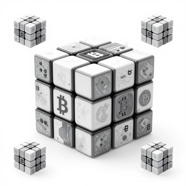 Digital illustration of a 3D Rubik's cube composed of black and white blocks with Bitcoin symbols, surrounded by four smaller cubes.