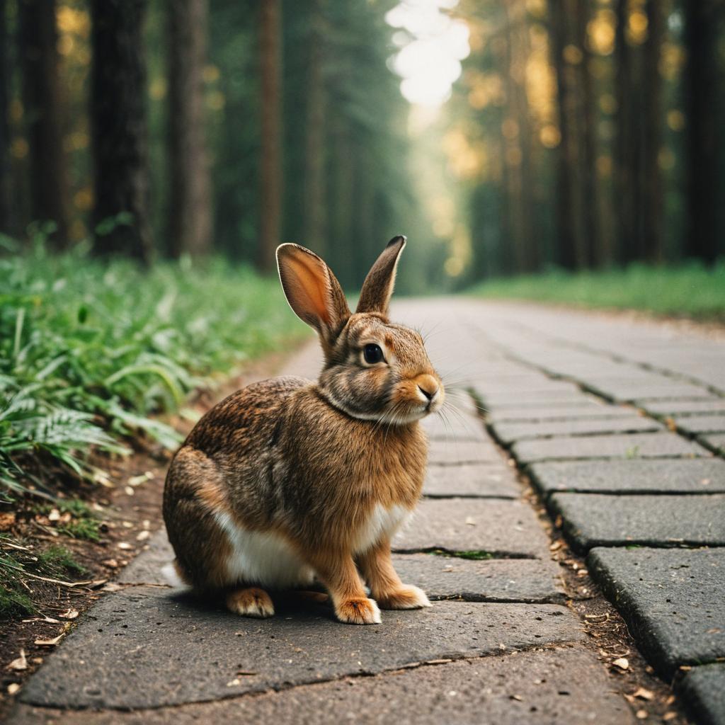 A realistic close-up portrait of a brown rabbit sitting on a paved path in a forest. The image features soft natural lighting that highlights the rabbit's fur texture, with a shallow depth of field creating a blurred green and brown background of trees and foliage. Warm color tones emphasize a cozy atmosphere in the natural setting.